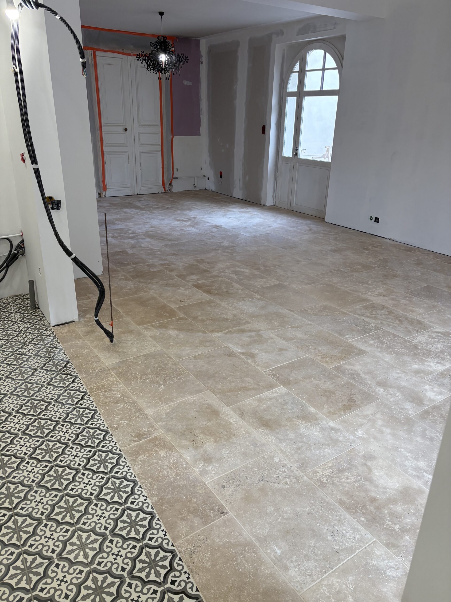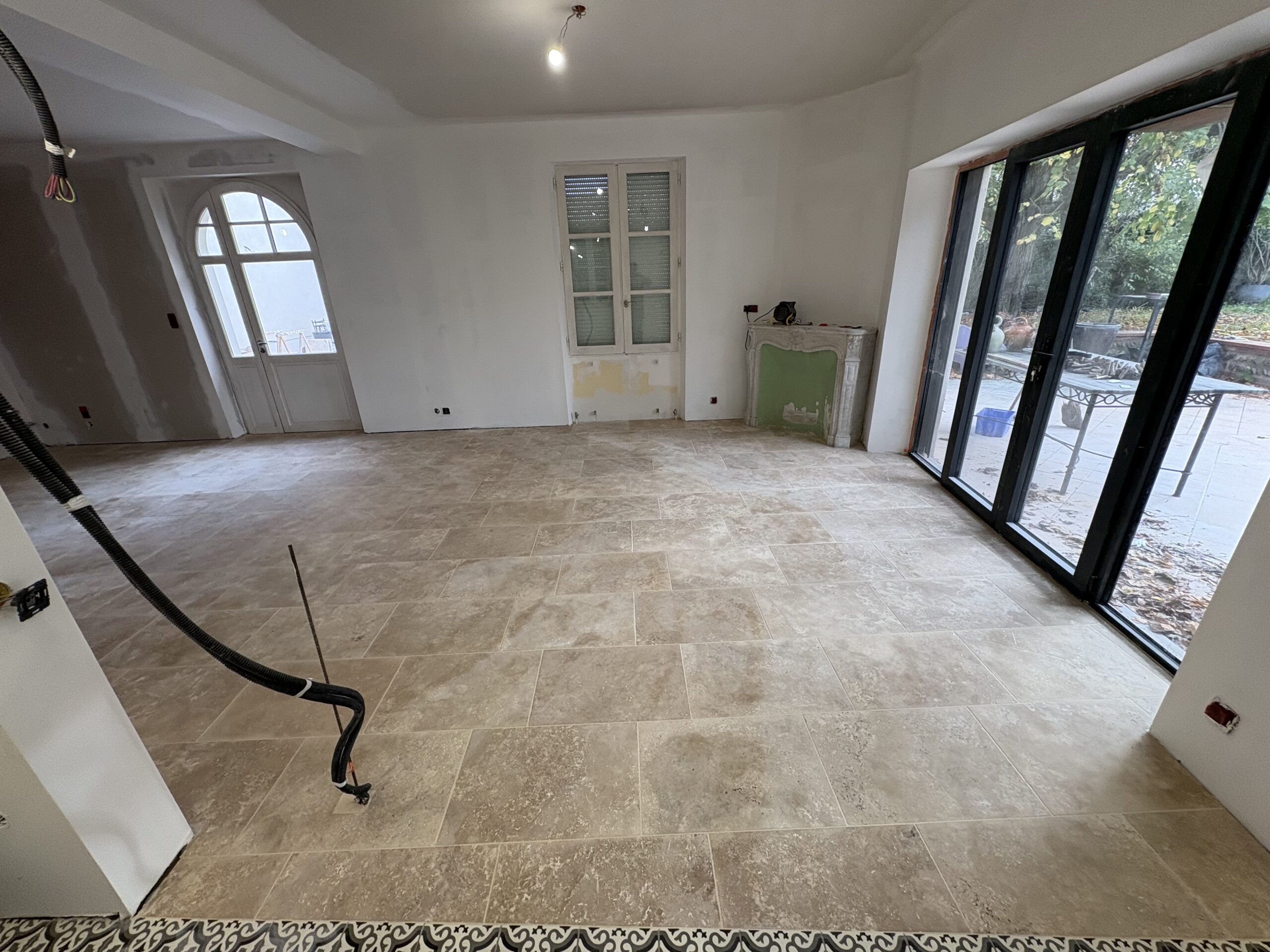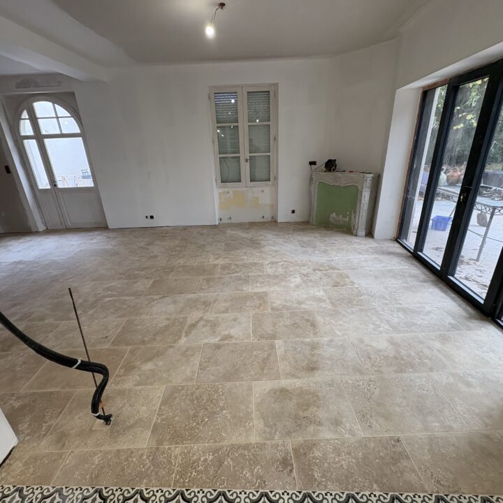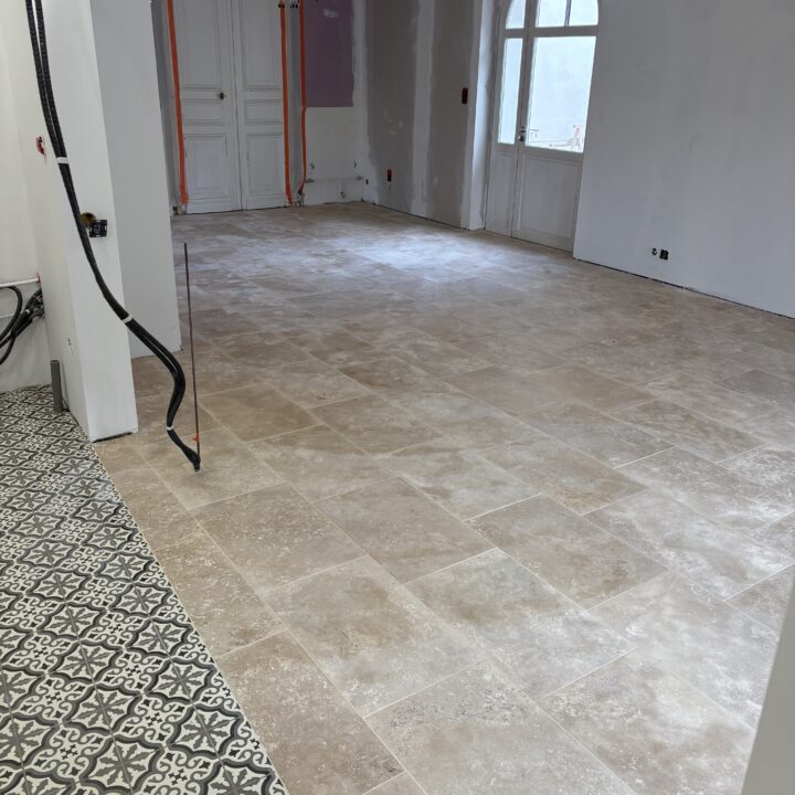 Le sol obtenu offre un rendu à la fois authentique et structuré, combinant la sobriété du travertin et le caractère du carreau ciment.