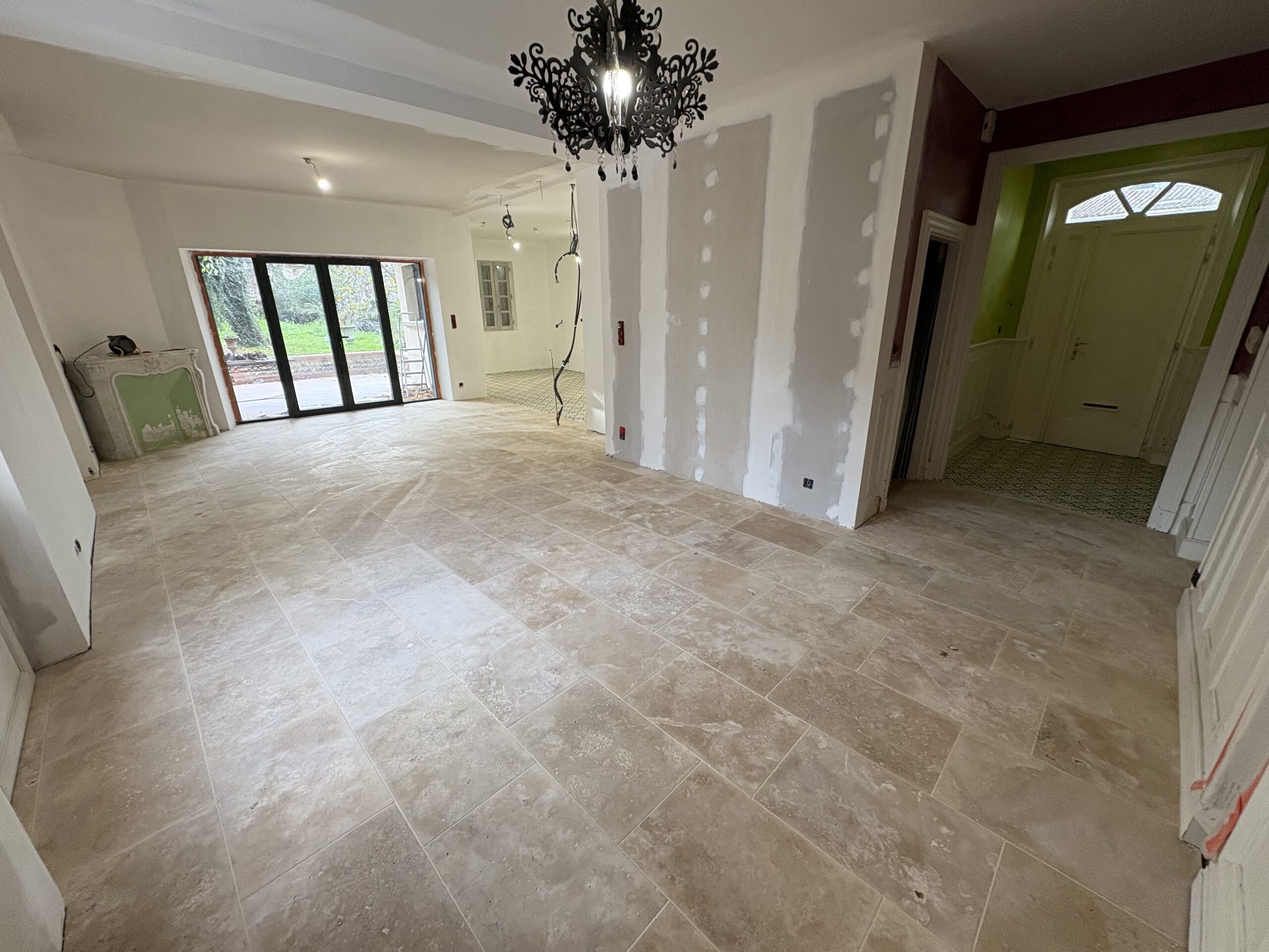 Cette réalisation concerne la pose d’un travertin format 60×40 et d’un carrelage imitation carreau de ciment format 20×20 à Grenade Sur Garonne. Les pièces rénovées sont l’entrée, la salon, la salle à manger ainsi que la cuisine. Le travertin est une pierre naturelle qui apporte charme et authenticité dans les pièces de vie.